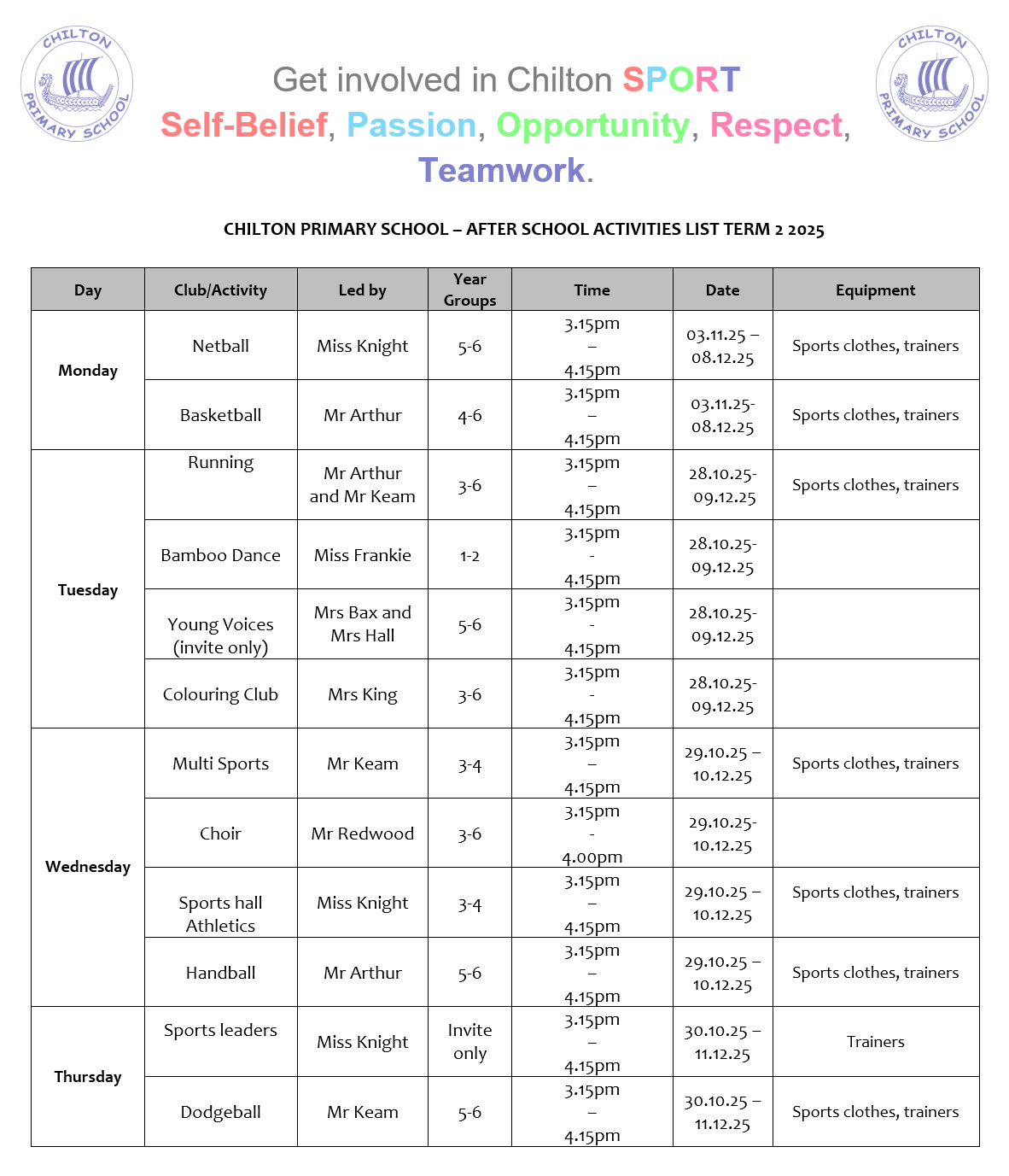 At Chilton Primary School, we aim to inspire children to lead healthy, active lifestyles through the teaching of a broad range of activities in Physical Education and Physical Activity. In this way, we hope to engage our children in competitive sports both in and out of school hours. Our extensive curriculum challenges learners to excel in all strands of PE and aims to bridge the gap between disadvantaged pupils. As a result, children embed the values of our school and the importance of staying fit through the enjoyment of Physical Education and Physical Activity.