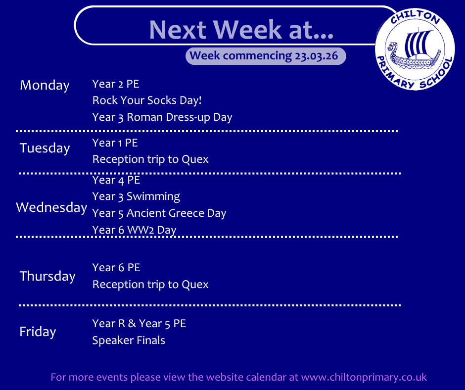 • Friday: Our speaker finalists will represent Chilton at the Royal Harbour—best of luck to them! Families are also invited into school from 3 o'clock until 3:30pm to look at their child’s learning ahead of Parent Teacher Consultations in the final week of term.
