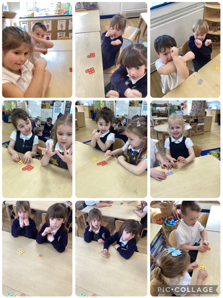 This week we have been learning about addition. We have been looking at stories involving addition and making up our own stories e.g. there are 6 pigs playing in the mud. 2 more pigs come along. Now there are 8 pigs in the mud. We then used numicon tiles to add 2 amounts together before moving on to adding 2 amounts together on a tens frame.