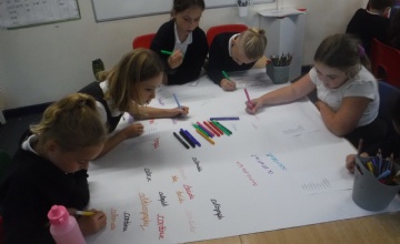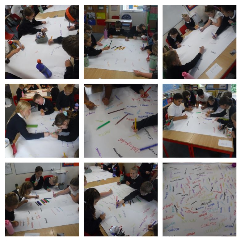 We really enjoyed one of our spelling lessons this week where we made ‘spelling tablecloths’. The children covered large pieces of paper in the words we learnt this week in lots of different colours. They looked great. Here we are doing this…