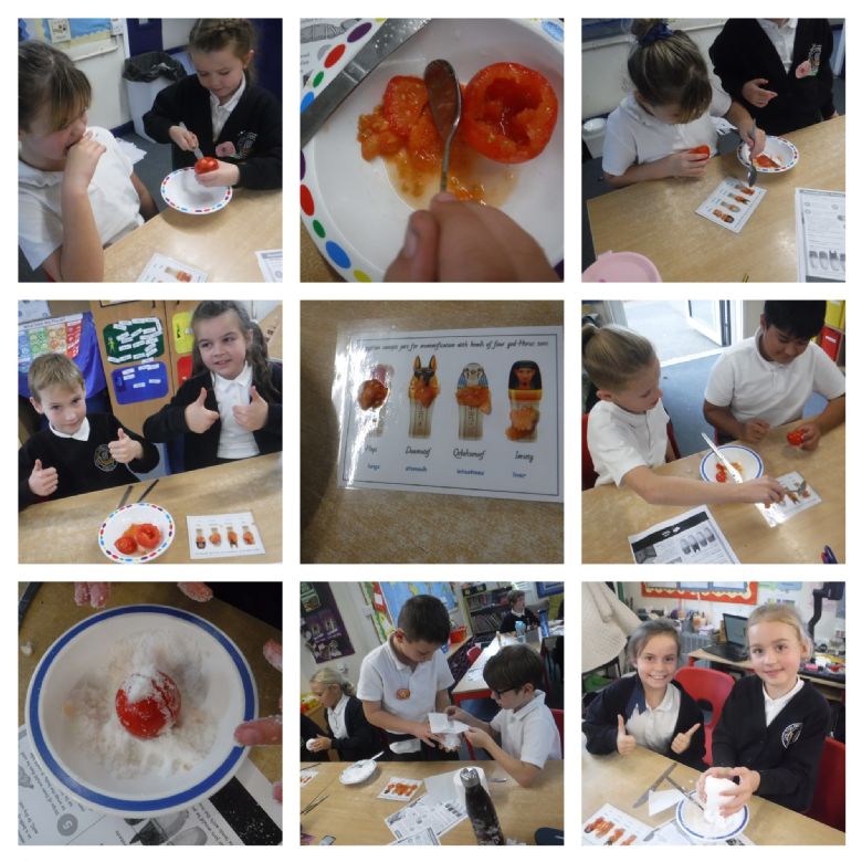 In ‘Walk like an Egyptian’ this week we learnt about the social hierarchy of the Ancient Egyptian civilisation and that they were ruled by pharaohs who had supreme control over everything. We found out about Ancient Egyptian Gods and Goddesses. We have also learnt about the mummification process and thoroughly enjoyed mummifying a tomato! Here we are doing this…