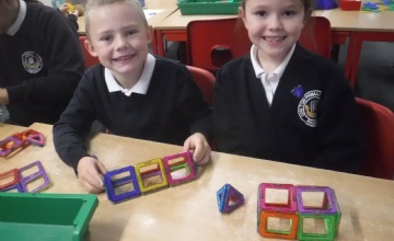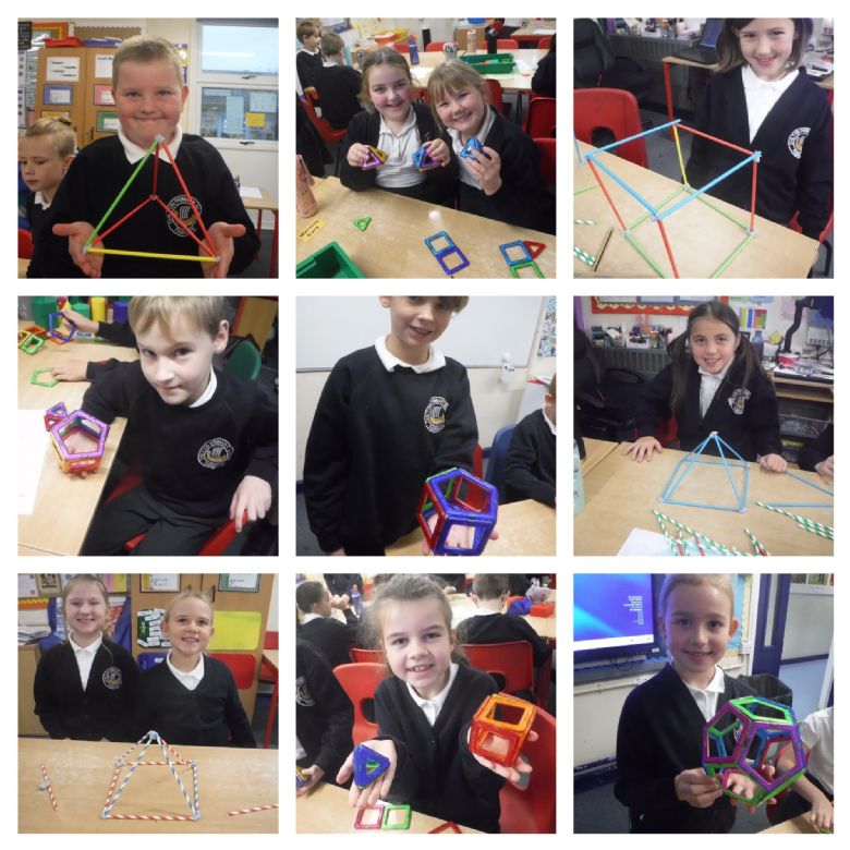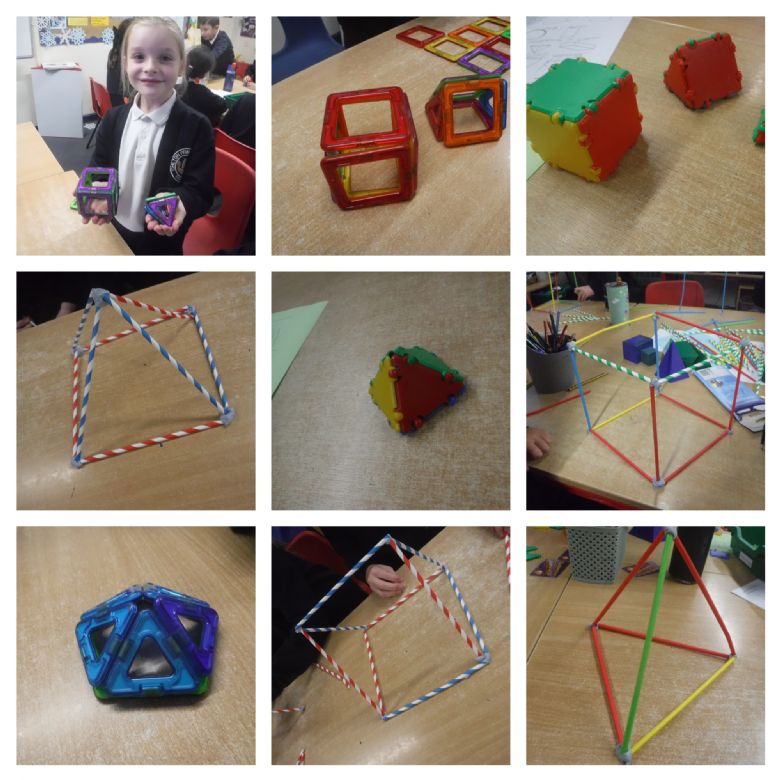 In maths this week, we have been learning some more about shape. We have learnt about different types of quadrilaterals; square, oblong, trapezium, parallelogram, rhombus and irregular quadrilaterals. We found out the properties of each of these 2D shapes e.g. a parallelogram has 4 straight sides, no right angles and 2 sets of parallel sides and a trapezium has only 1 set of parallel sides, no right angles and 4 straight sides. We then went on to learn about 3D shapes. We learnt to name and describe 3D shapes using maths vocabulary such as vertices, faces and edges. The 3D shapes we learnt about are cone, cylinder, sphere, hemi-sphere, cube, cuboid, tetrahedron (aka triangular based pyramid), square based pyramid, triangular prism, pentagonal prism and hexagonal prism. Some of us learnt about octagonal prisms, and pentagonal and hexagonal based pyramids. Here we are having great fun making 3D shapes...