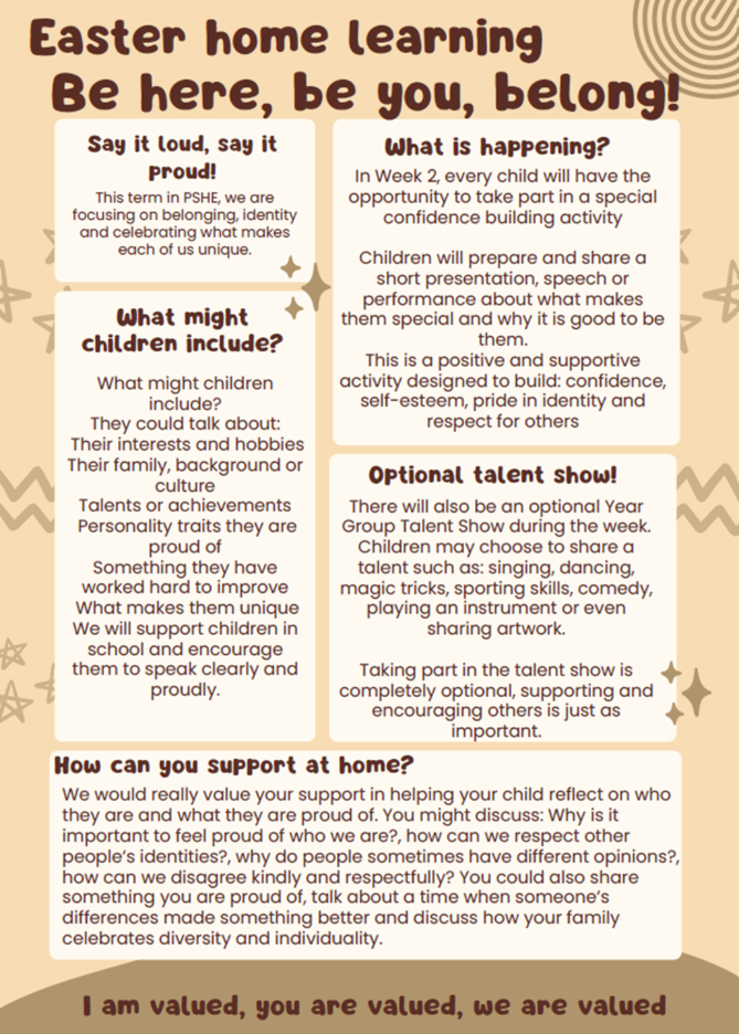 Friday 22nd May – Be here, be you, belong parade on top field from 2pm. Children to wear clothes that they feel express who they are; this could be from an outfit from a hobby they have to bright colourful clothing. All parents invited to watch.
